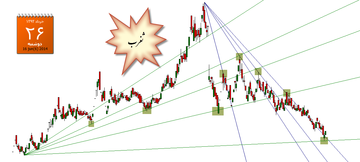 مطالعه در این زمینه را تازه آغاز کرده ام. منابع قابل اتکا در این زمینه بسیار محدود است. در واقع افراد و سازمان هایی هم که به روش معاملاتی گن اشراف دارند، این اطلاعات را به صورت کامل و آسان در اختیار کسی قرار نمی دهند. با تسلط به روش معاملاتی گن با استفاده از زوایای گن، نقاط برگشت قیمت با دقت بسیار بالا قابل پیش بینی است. شاید به مانند نمونه زیر برای نماد ثغرب.